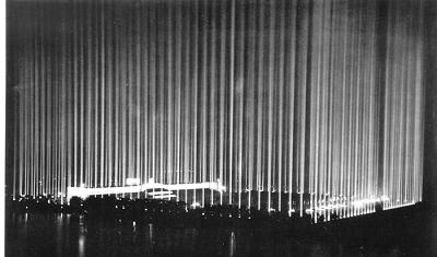 In der Phantasie hatten wir einen jungen Mann begleitet aus dem Ersten Weltkrieg durch die zwanziger Jahre mit ihren Wirren und Katastrophen bis zu den Reichsparteitagen in Nürnberg. Hitler präsentiert sich auf den Reichsparteitagen als Retter und ErlöserMan muss sich die Filme ansehen. In einem Lichtdom von 150 Flakscheinwerfern rings um das Zeppelinfeld präsentierte sich der Führer als Retter und Erlöser des Volkes dort oben auf der Tribüne. Es war eine religiös aufgeladene Atmosphäre - und nicht wenige werden hier (oder bei anderen ähnlichen Feiern) ein heiliges Gelöbnis geleistet haben: Unsere Ehre heißt Treue.