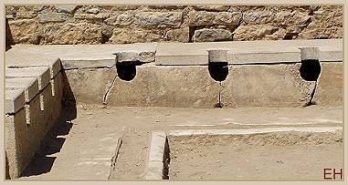 | mit einer öffentlichen Toilette - ein großer Raum, an dessen Wänden die steinernen Bänke mit den Kloöffnungen zur längeren Sitzung einladen - | ![]() |