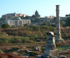 | Vom Tempel der Artemis steht nur noch eine Säule, auf der die Störche nisten. | ![]() |