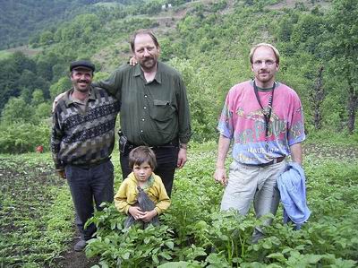 | Pastor Frieder Weinhold (Mitte) im Mai 2005 in den Bergen bei Pogradec, Albanien |