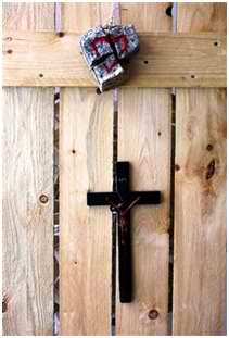 Doch auf dem bedrohlichen Stein ist ein rot gemaltes Herz sichtbar - wie die Hoffnung auf einen barmherzigen Richter. Von dem Stein zieht der Faden weiter zum Kreuz, er umschlingt den Körper des Gekreuzigten - der ist auf der Seite blutig rot, und rot hängt der Faden unter den Kreuz hinunter. Dort sind im unteren Drittel der Wand zwei Klemmen angebracht, an einer ist das Zeitungsbild eines wahrscheinlich Aids- kranken Kindes in einem Slum, darunter ein Kind in einer Steppenlandschaft, als ob es verdurstet. |