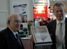 | Horst Marquardt ist Veranstalter und Gründer des evangelischen Nachrichtendienstes idea. Er drückt den Besuchern und Teilnehmern am Ausgang die "Nürnberger Erklärung" in die Hand. | ||