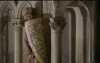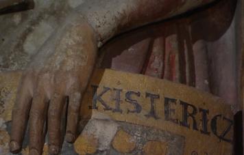 Es sind keine Heiligen wie in den meisten Chorhallen, es sind konkrete Personen, die Namen stehen in einer Urkunde und zum Teil auf den Schilden der Männer. Zwar lebten sie 100 Jahre vor dem Meister, doch man glaubt sie lebendig vor sich zu sehen, jeder mit einem ganz eigenen Charakter, ja, im Beziehungen zueinander, Beziehungen mit Schuld und Gericht, mit Macht und Ohnmacht, mit Feindschaft und Liebe. Keine Geschichte wird erzählt - manche ihre Geschichten sind bekannt. Timor grollt, er hat einen Mord auf dem Gewissen, Rache für eine Ohrfeige vor einem Jahr. Wütend schaut er hinüber zu Ekkehard, der hatte seinen Vater umbringen lassen. Uta, Ekkehards Frau, diese edle wunderschöne Frau hält rechts ihren Mantel hoch und verbirgt ihr Gesicht vor ihrem Mann, der hatte für den Tod ihres Bruders gesorgt. |